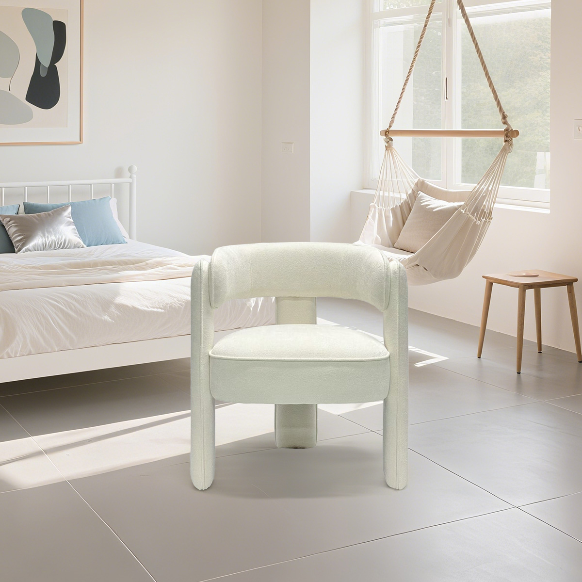 Moderne witte boucle-accentstoel met open rug – gestoffeerde eetkamer- en woonkamerfauteuil