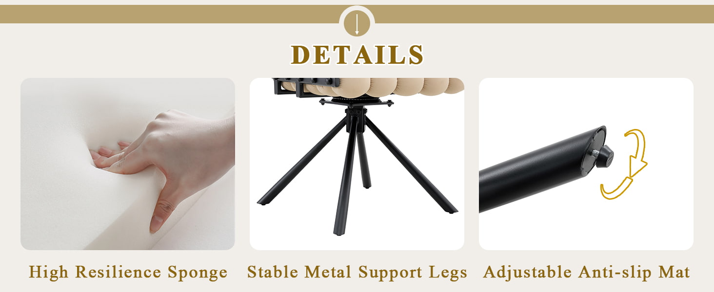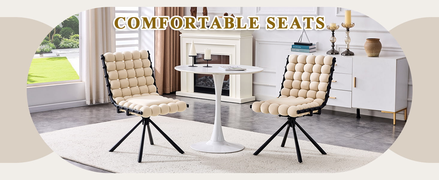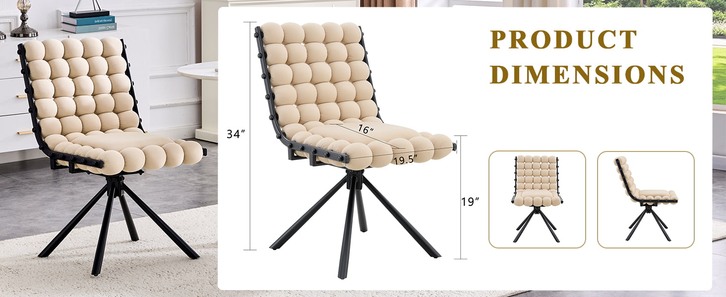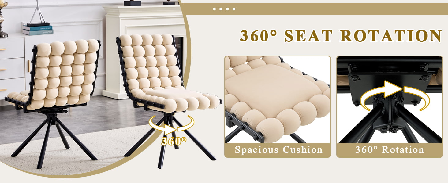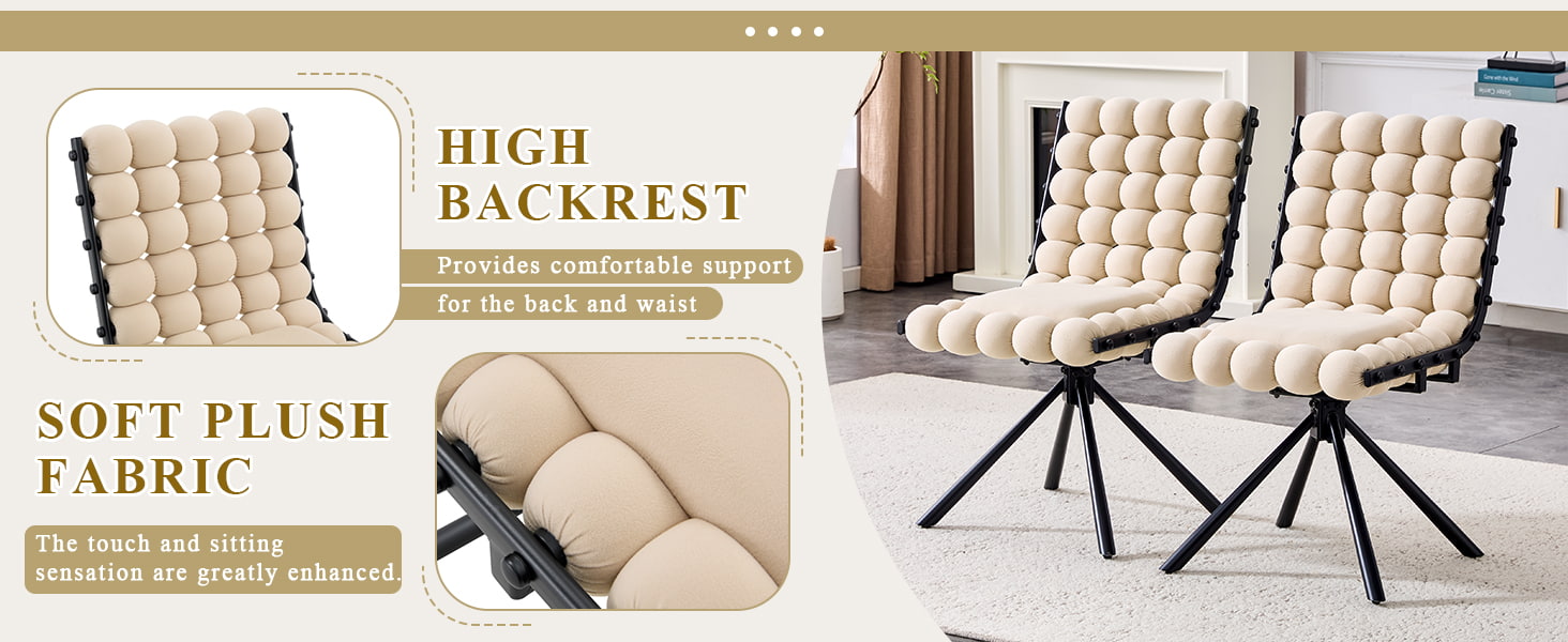 Deze fluwelen draaibare eetkamerstoel is ontworpen voor moderne eetruimtes, lifestyle-interieurs en commerciële boetiekomgevingen. Met een sculpturale bubbelkussenrugleuning en gladde Nederlandse fluwelen bekleding combineert de stoel een opvallend design met alledaags comfort. De 360 graden draaifunctie maakt flexibele beweging mogelijk, terwijl de stevige metalen poten en de basis zonder wielen betrouwbare stabiliteit bieden in eetkamers, woonkamers, make-upruimtes en cafézitplaatsen. De ergonomisch gebogen rug en de zeer veerkrachtige sponsdemping helpen de lichaamsdruk gelijkmatig te verdelen en bieden comfortabele ondersteuning tijdens langdurig zitten.