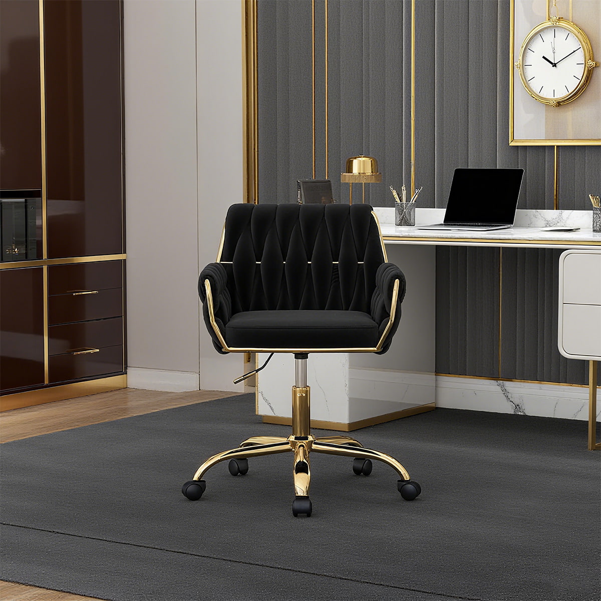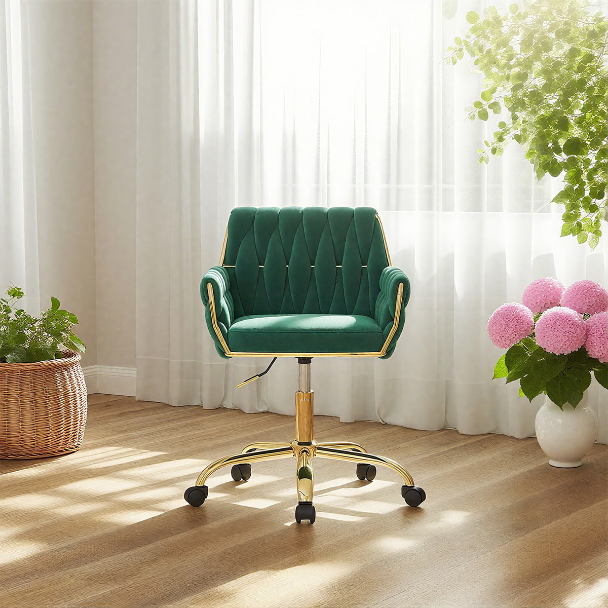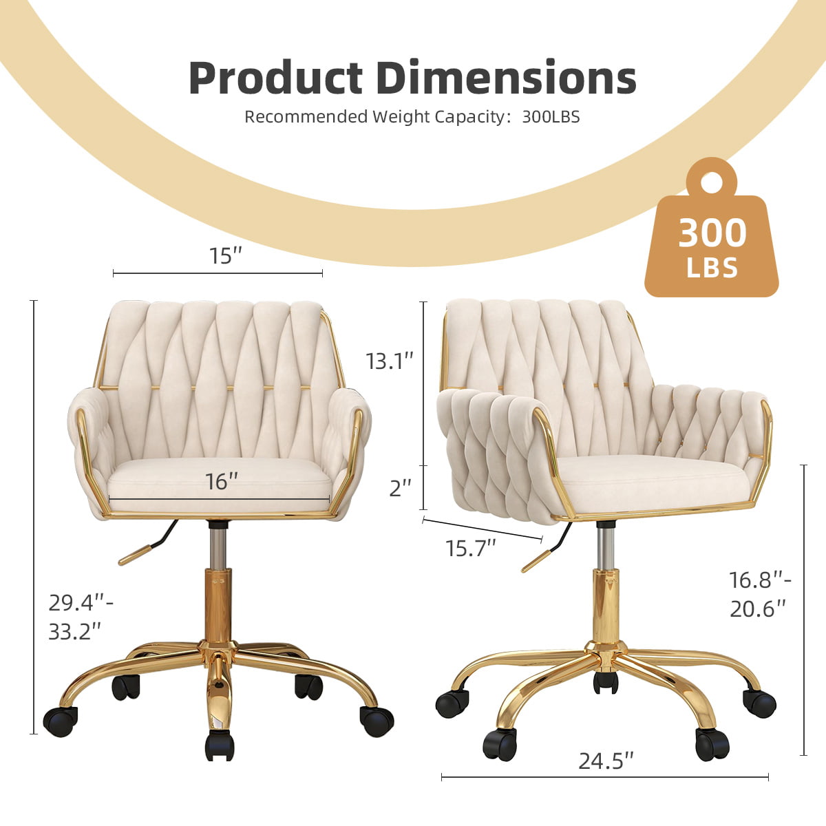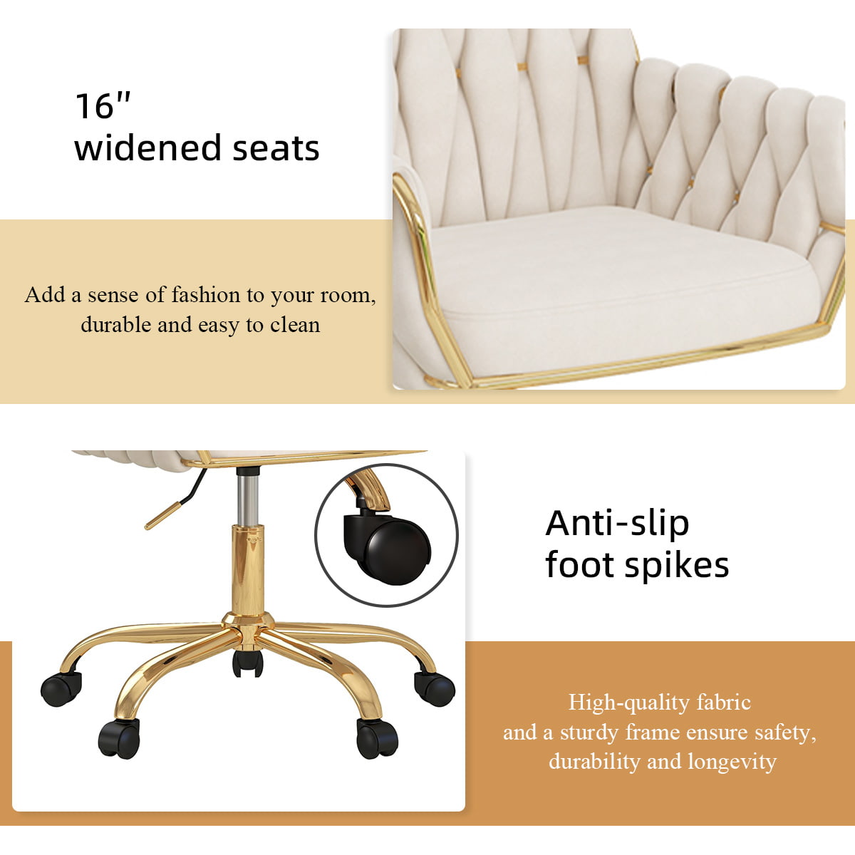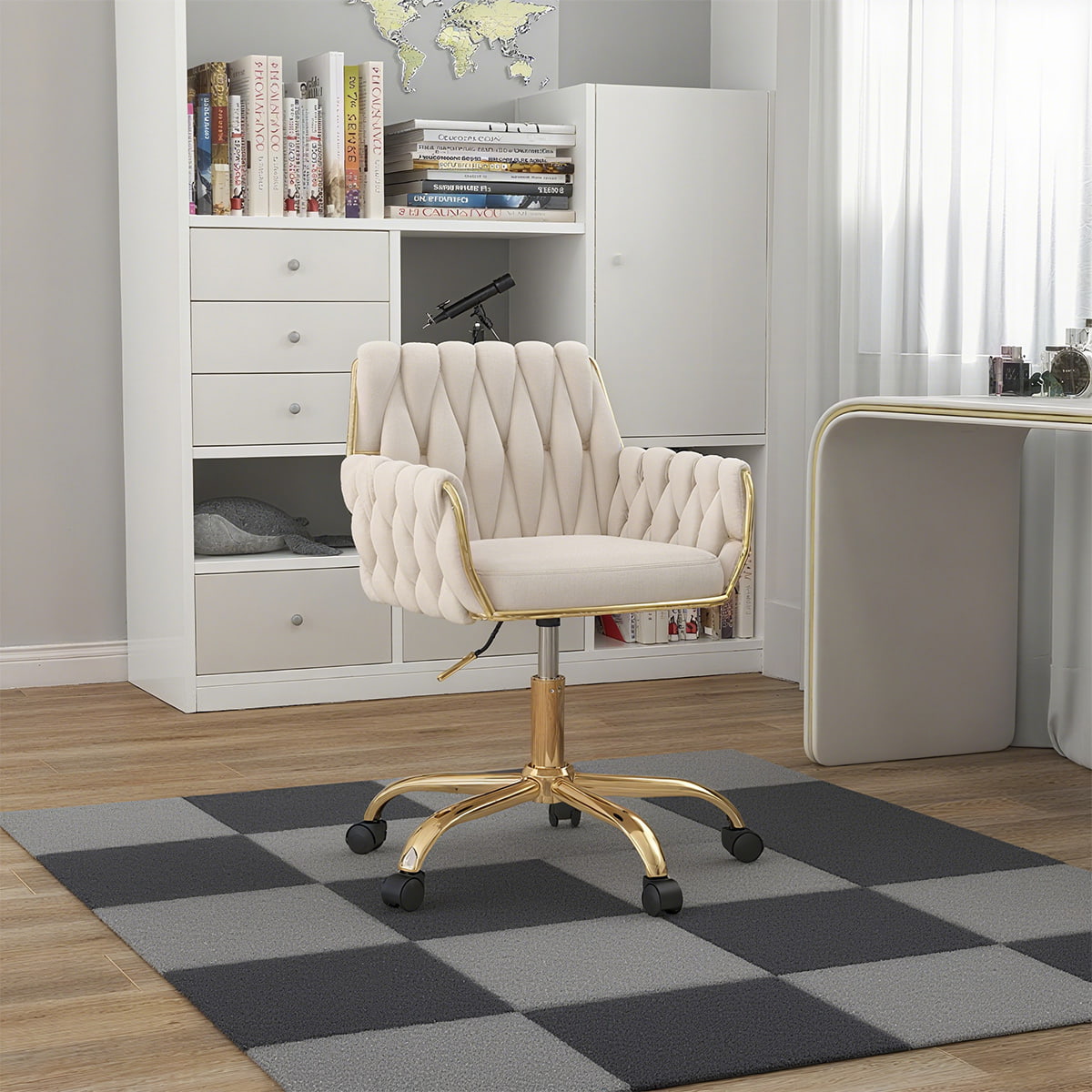 Beige fluwelen thuiskantoorstoel – moderne verstelbare kaptafelstoel met gouden onderstel, handgeweven rugleuning en armleuning, 360° draaibare rollende bureaustoel