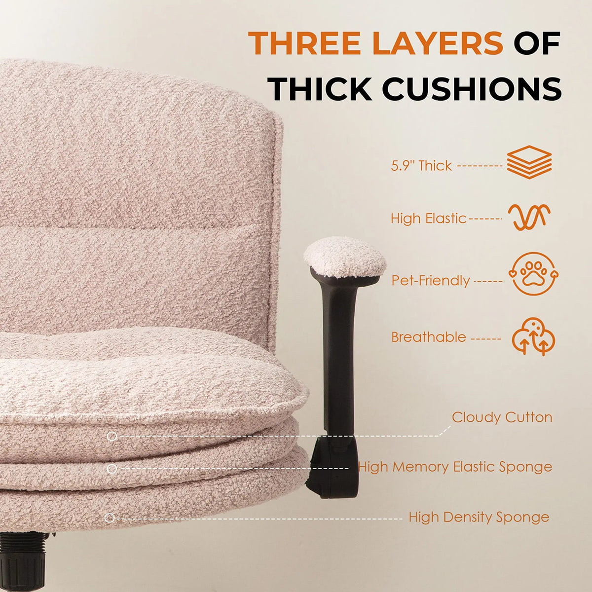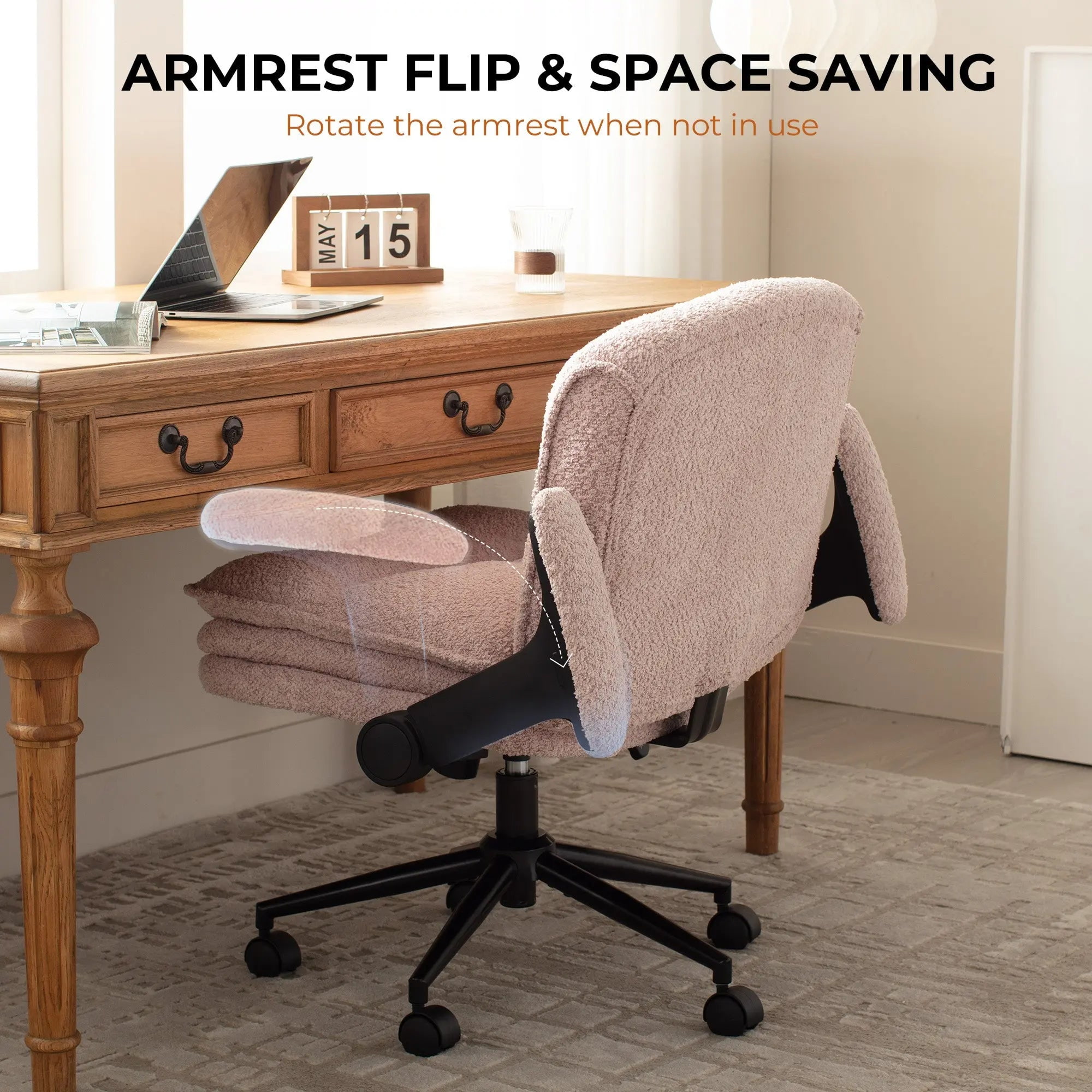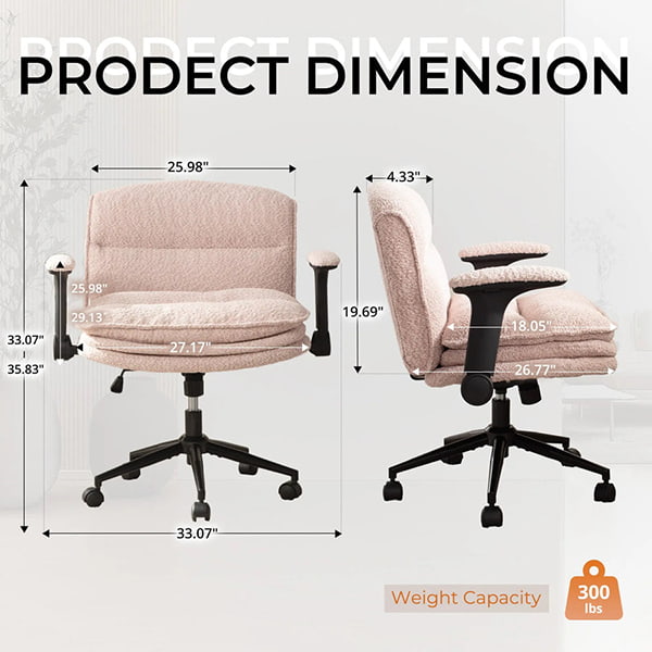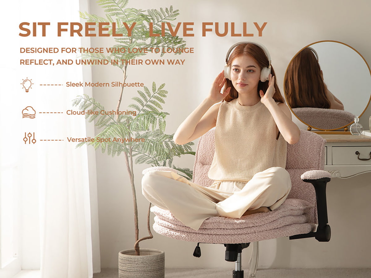 ① Criss Cross-bureaustoel met opklapbare armen en drielaags kussen – Ergonomische Bouclé-bureaustoel met brede zitting en wielen