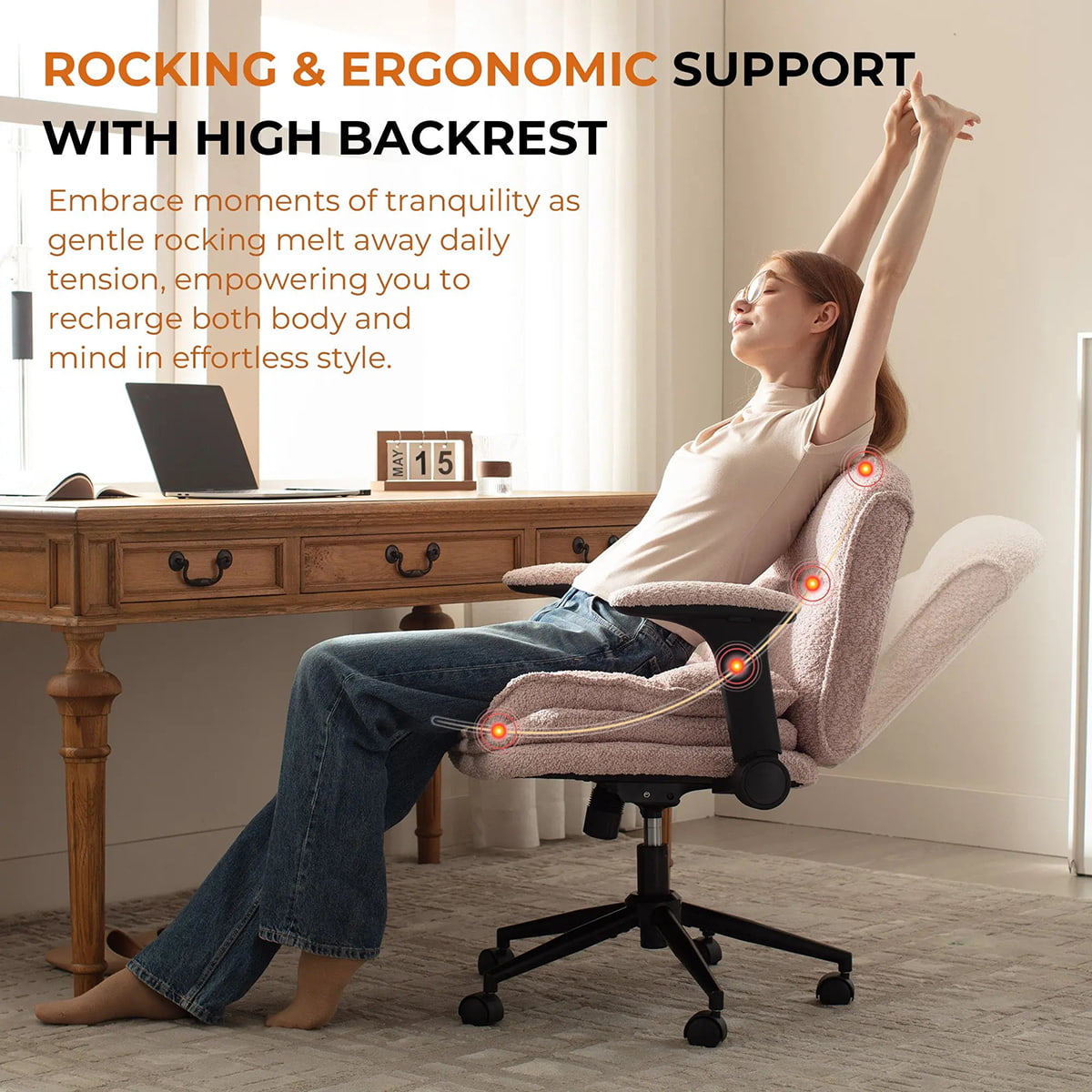 Opklapbare armleuningen maximaliseren de flexibiliteit: u kunt gemakkelijk met gekruiste benen, zijwaarts, opgerold of rechtop zitten. Deze stoel is gebouwd voor comfort, beweging en stijl, perfect geschikt voor thuiskantoren, slaapkamers en creatieve ruimtes.
