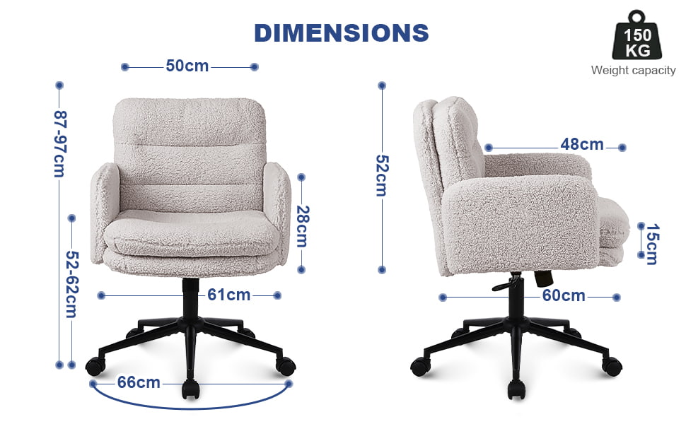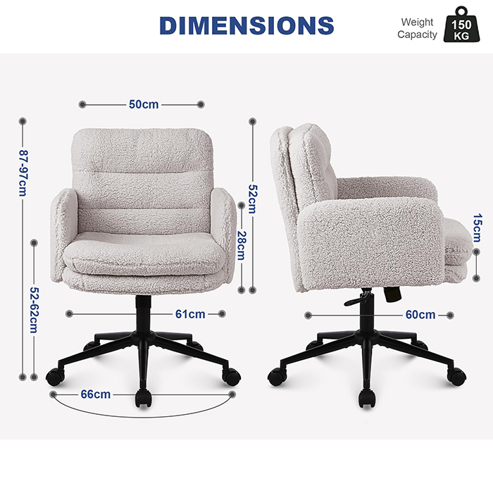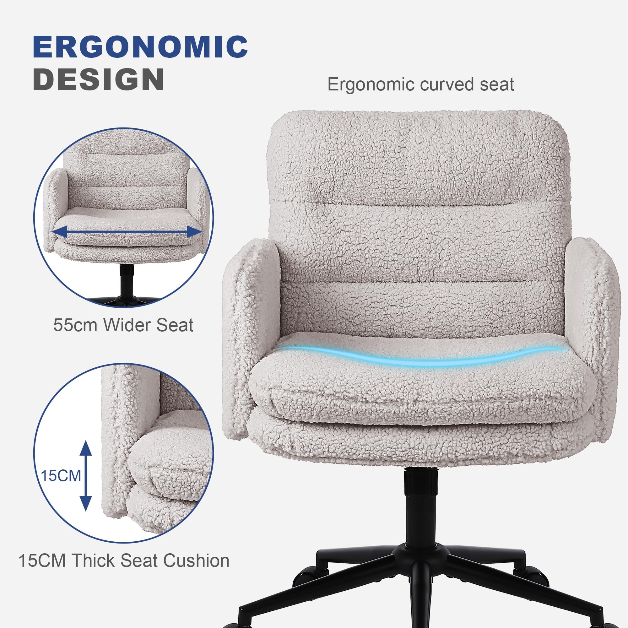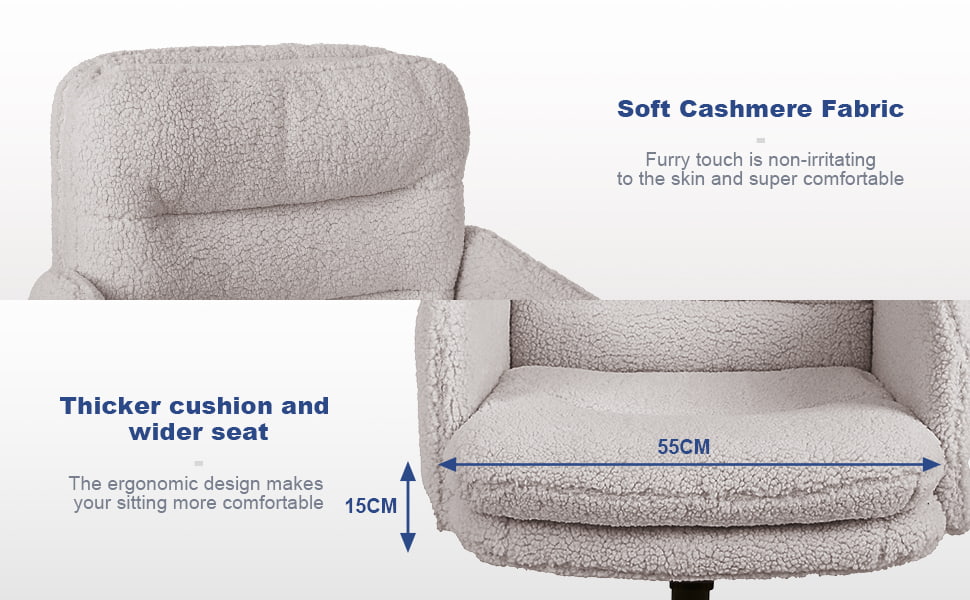 Deze bureaustoel van kunstkasjmier is ontworpen voor kopers die op zoek zijn naar een balans tussen comfort, esthetiek en betrouwbare productiekwaliteit. De stoel is bekleed met zachte, huidvriendelijke kunstkasjmierstof en heeft een verdikt kussen van 15 cm met hoge dichtheid dat langdurige ondersteuning biedt zonder in te klappen, waardoor hij ideaal is voor langdurig werk, studeren of gebruik in de kaptafel. De ergonomische zitstructuur, gecombineerd met een soepele draaibeweging van 360 graden, hoogteverstelling en een zachte schommelfunctie, verbetert het dagelijkse zitcomfort met behoud van een strakke, moderne uitstraling die geschikt is voor thuiskantoren, slaapkamers en lifestyle-georiënteerde interieurs.