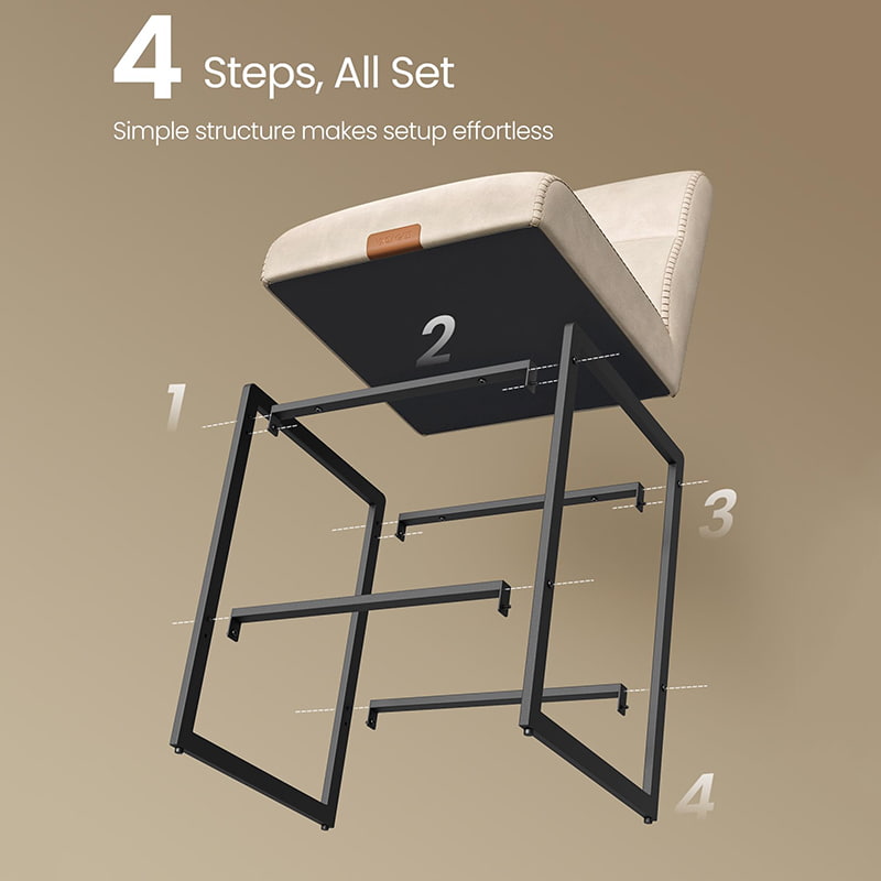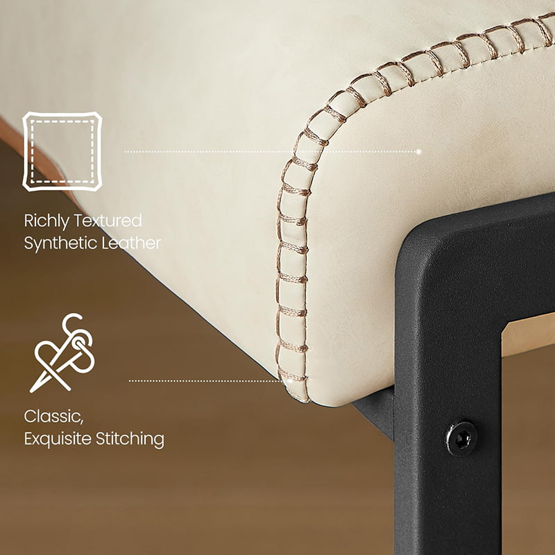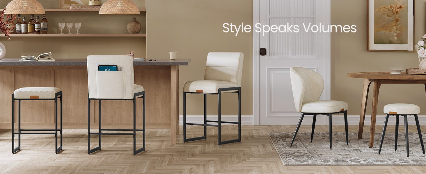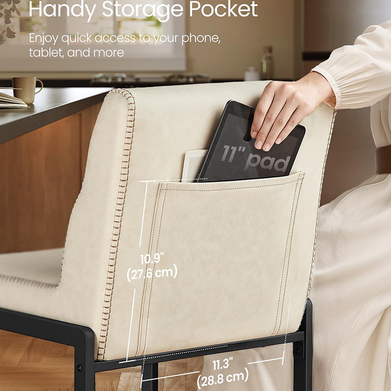 Het gladde oppervlak van synthetisch leer is gedetailleerd met subtiele stiksels, waardoor het een ambachtelijke uitstraling krijgt en toch gemakkelijk te onderhouden is: ideaal voor drukke huishoudens en licht commerciële omgevingen. Een zacht gebogen zittingrand helpt de druk op de benen te verminderen, terwijl de geïntegreerde achterzak handige opbergruimte biedt voor telefoons, tablets of kleine benodigdheden. Ondersteund door een stevig metalen frame met verborgen verstelbare poten, zorgt deze barkruk voor stabiliteit op verschillende vloeroppervlakken en past hij zich moeiteloos aan moderne keukens, eetruimtes of informele entertainmentruimtes aan.
