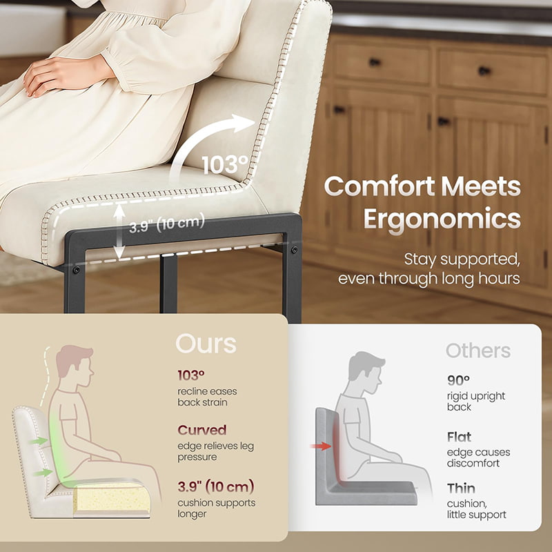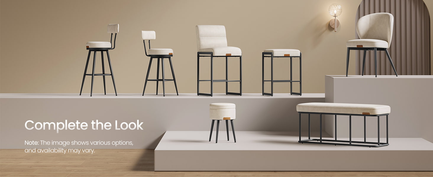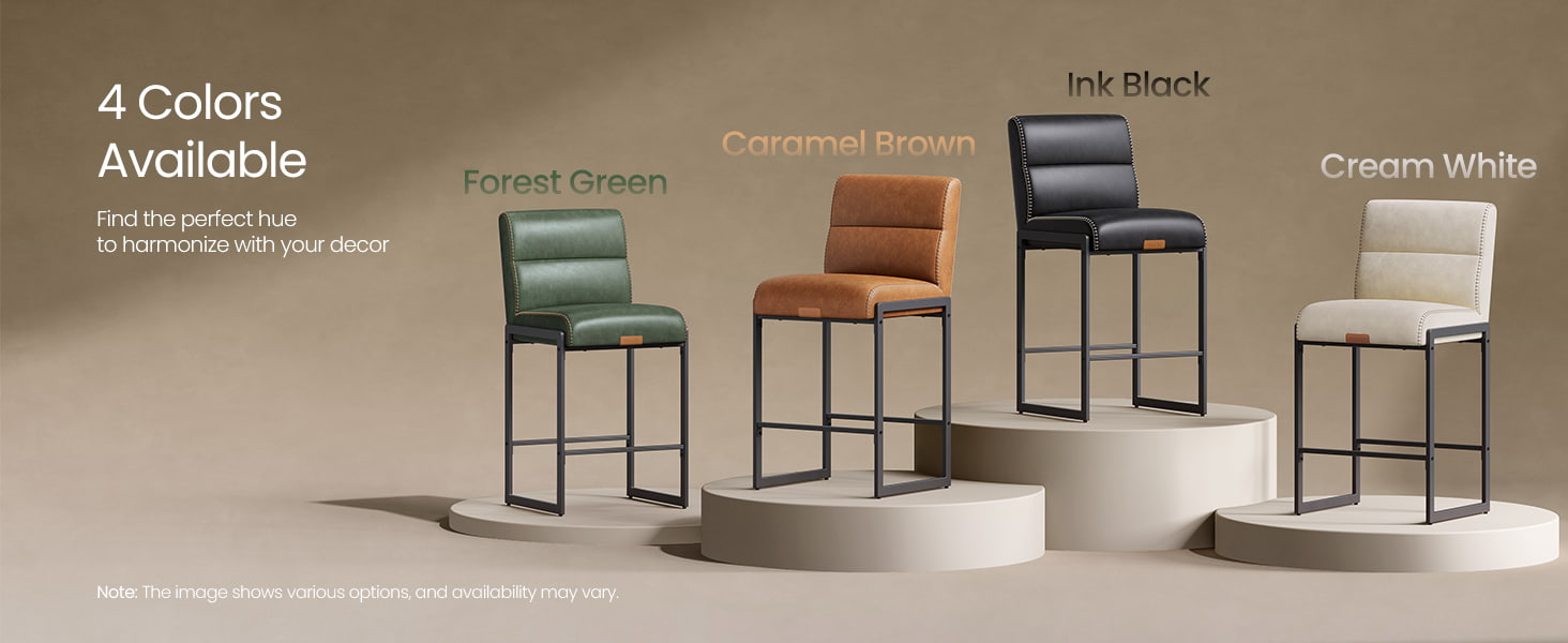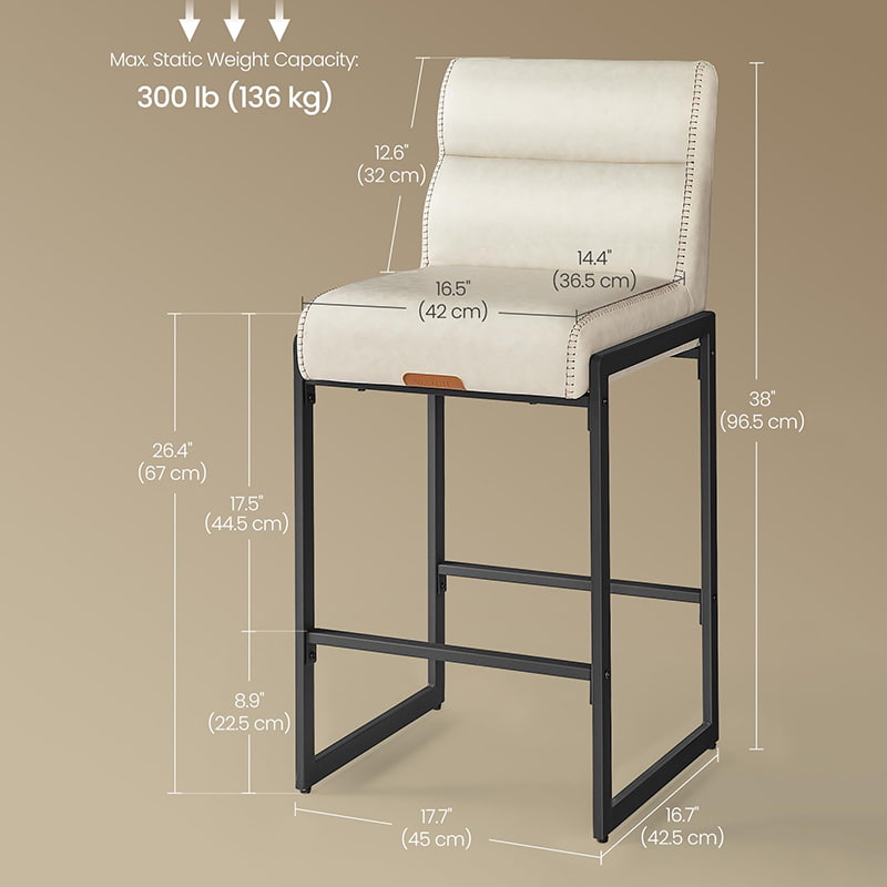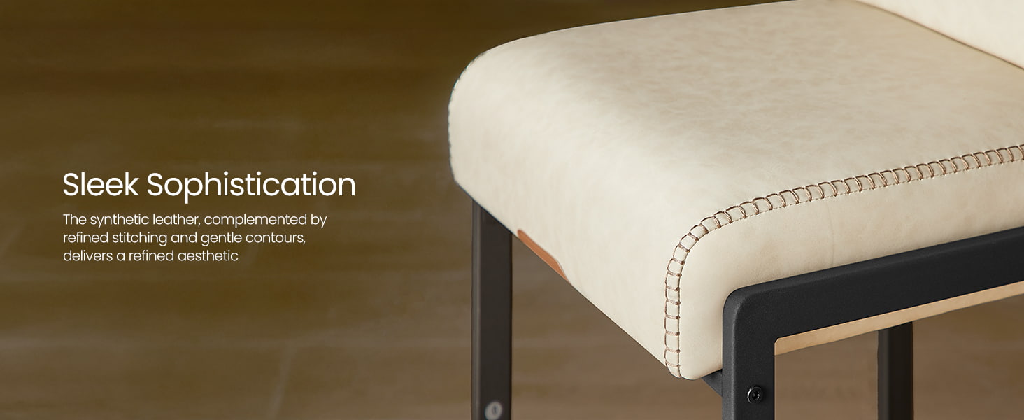 Deze crèmewitte stoelen op tegenhoogte zijn moderne barkrukken uit het midden van de eeuw, ontworpen voor aanrechtbladen en eeteilanden. Ze zijn voorzien van een duurzame bekleding van synthetisch leer met verfijnde stiksels en een strak architectonisch metalen frame. De ergonomische, in 103 graden gesegmenteerde rugleuning, de 9,5 cm dikke zitting met kussens en de gebogen voorkant zorgen voor langdurig comfort bij langdurig zitten, waardoor ze geschikt zijn voor zowel woonkeukens als licht commerciële omgevingen zoals cafés of showrooms.