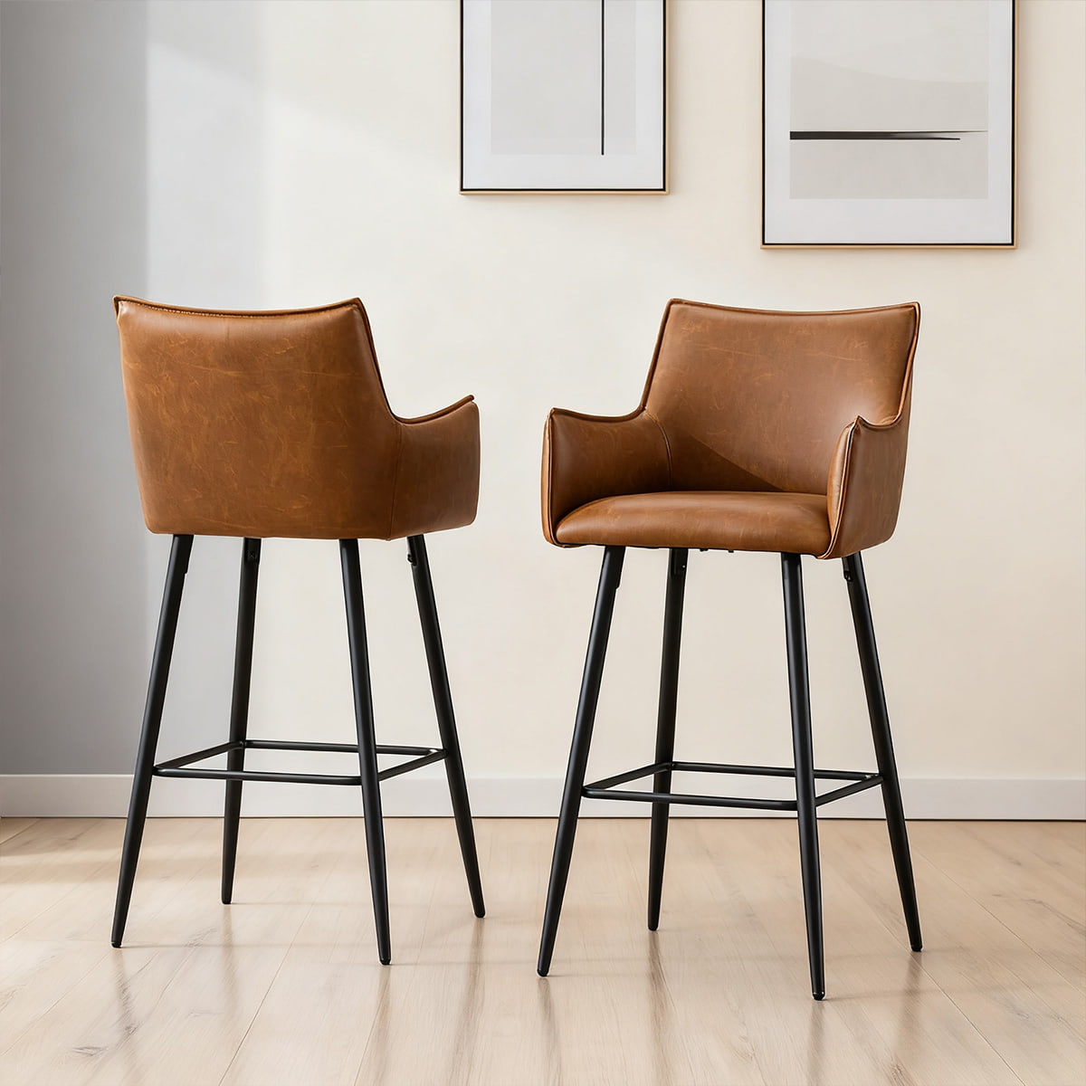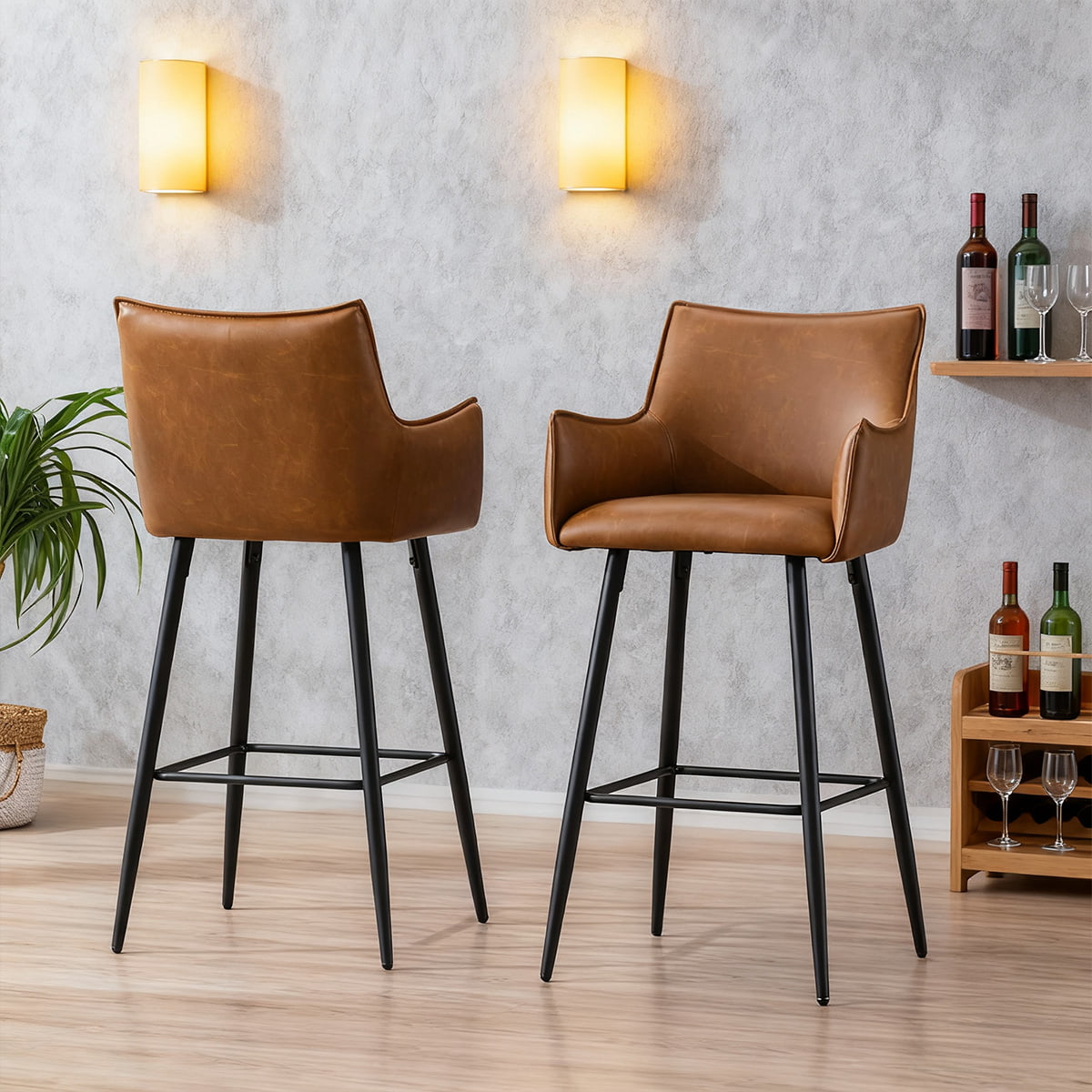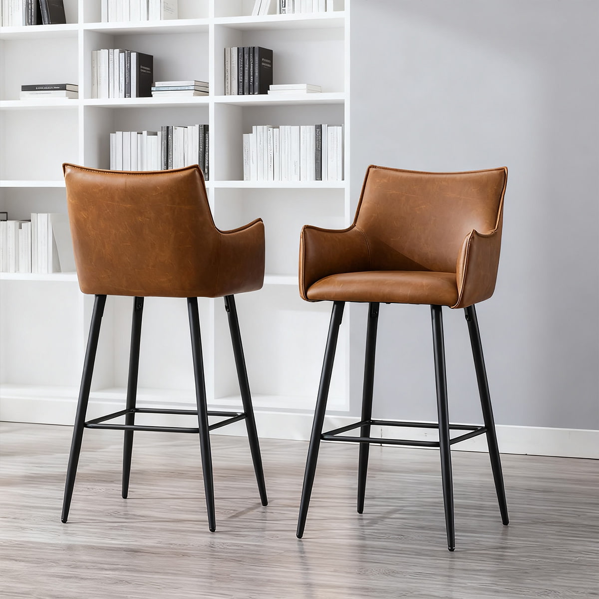 Moderne bruine PU lederen barkruk met armleuningen en rugleuning - Gestoffeerde barstoel op tegenhoogte met zwart metalen poten voor keukeneiland, bistro of thuisbar