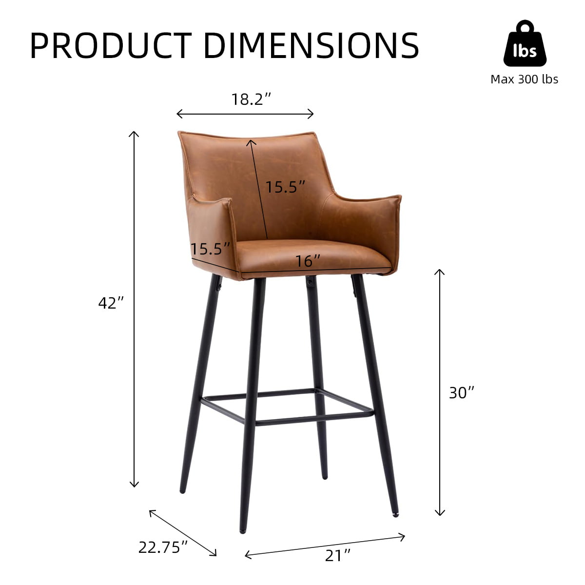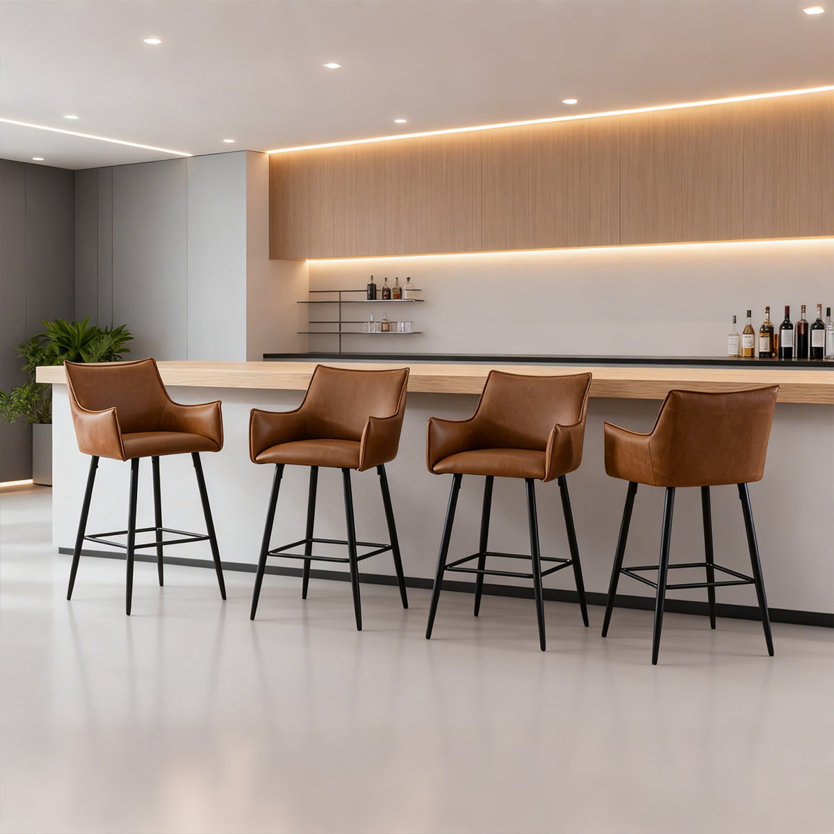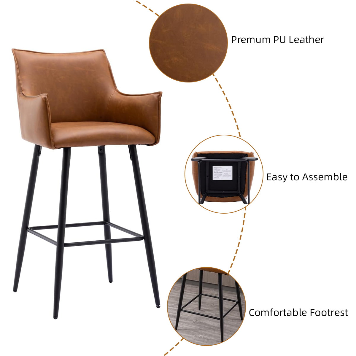 Moderne bruine PU lederen barkruk met armleuningen en rugleuning - Gestoffeerde barstoel op tegenhoogte met zwart metalen poten voor keukeneiland, bistro of thuisbar